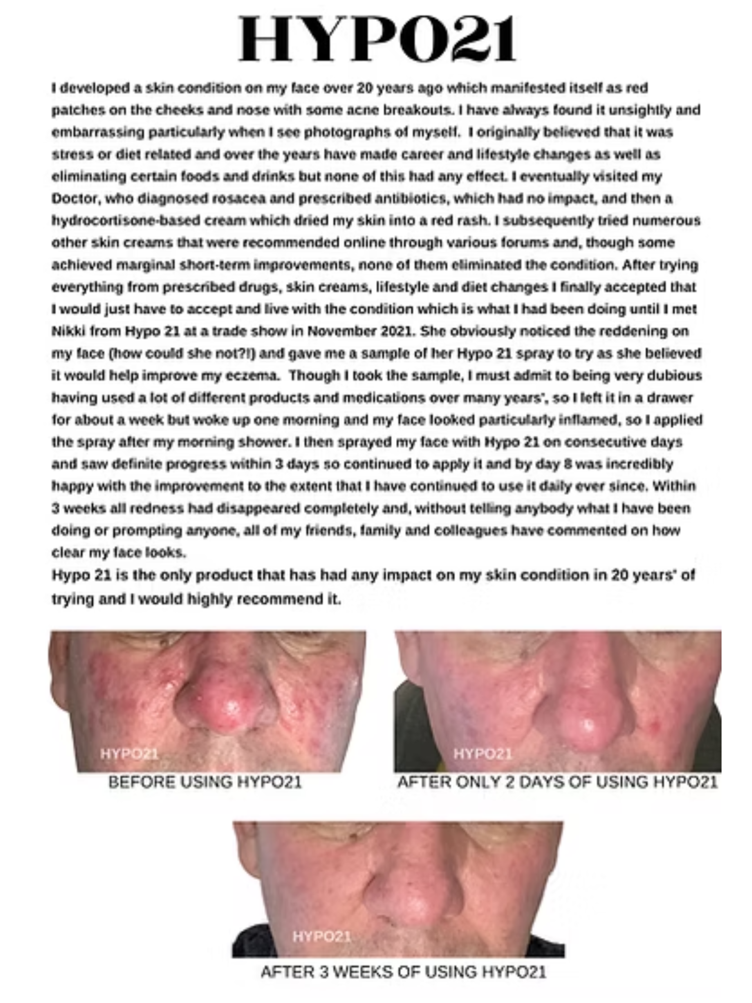 HYPO21 is suitable for people who may be prone to eczema, psoriasis, dermatitis, rosacea, acne and spots.
